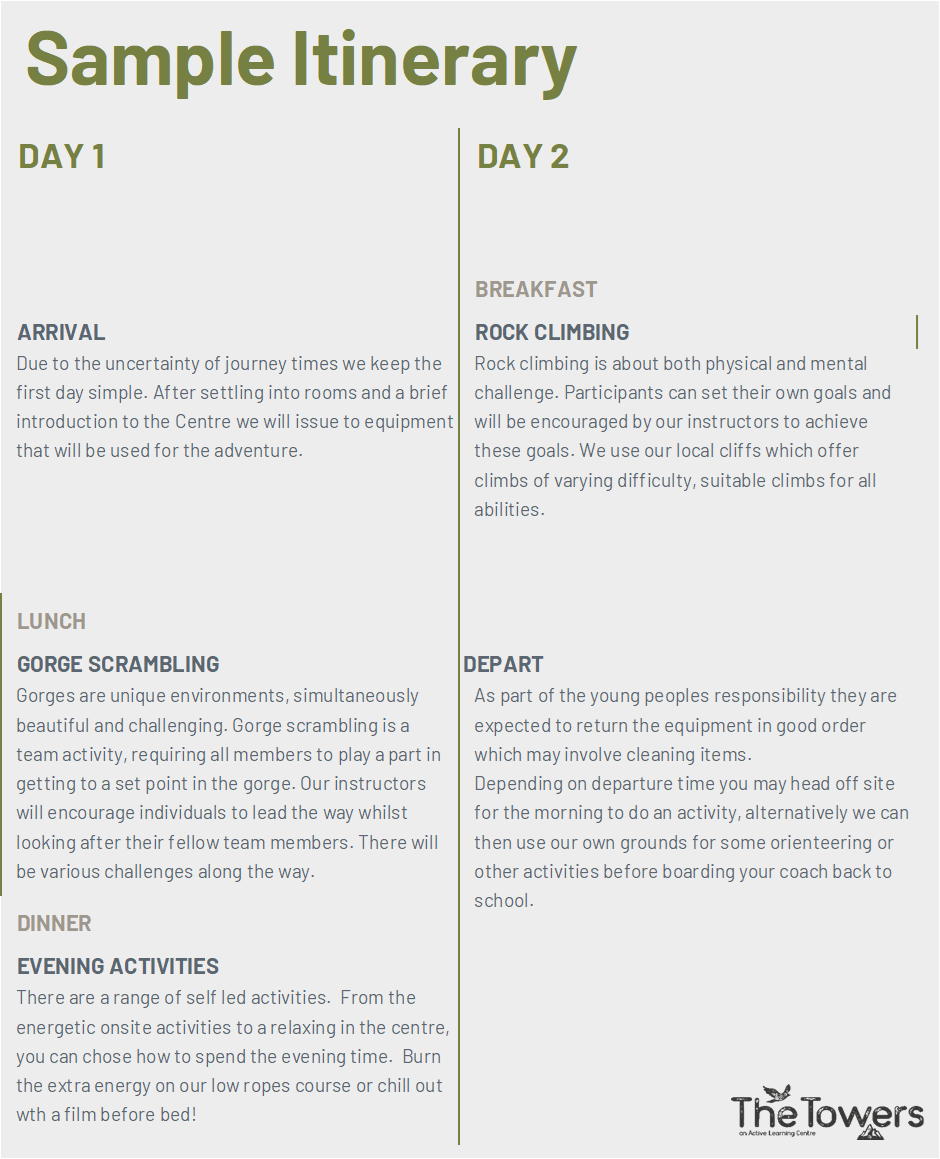 Explore the adventure that awaits your child on their Towers trip by downloading our sample itinerary. Gain insight into the exciting activities planned and get a glimpse of what each day holds. This resource will provide you with a preview of some the enriching experiences your child might embark on during their unforgettable journey.
